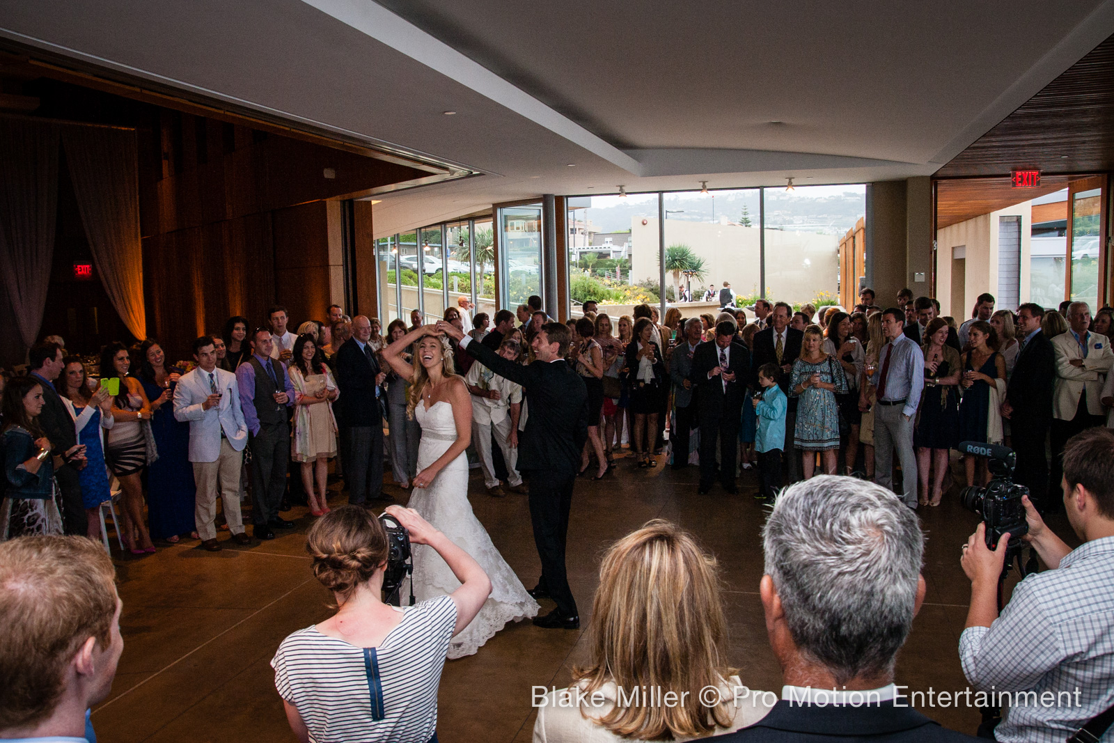Kristin and Niels got married and were honored to have helped them at their Scripps Forum Wedding with DJ/MC and Lighting Services. The venue looked beautiful inside and out, and the entire wedding was celebrated on site from the Ceremony overlooking the pacific ocean to the cocktail hour outside on the patio to the dinner and dancing inside the main hall. The night was highlighted by a customary Austrian Wedding March “Hochzeitsmarsch” which included a supply of hats for all the guests (and us vendors).